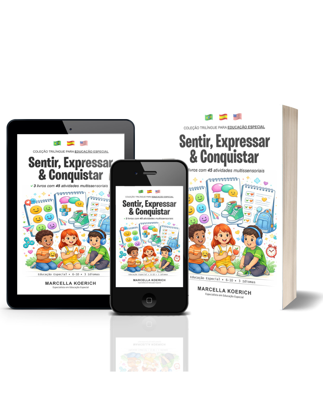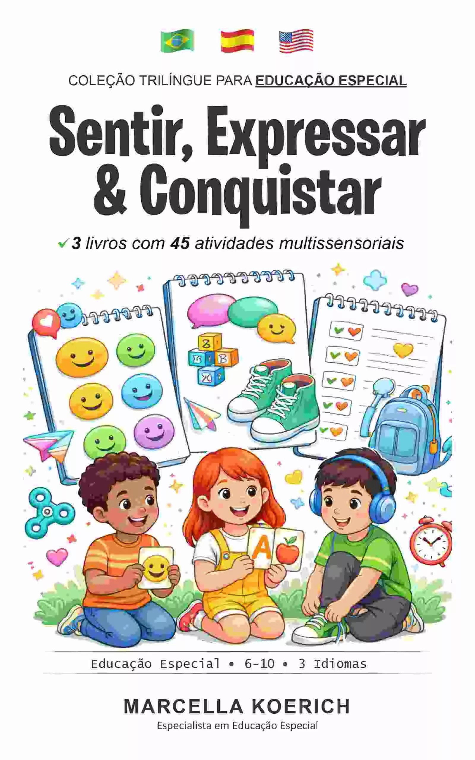A Coleção Trilíngue Educação Especial reúne 3 livros com 45 atividades multissensoriais em Português, Inglês e Espanhol, desenvolvidas para atender crianças de 6 a 10 anos com diferentes necessidades educacionais. Ideal para professores da educação especial, terapeutas ocupacionais, fonoaudiólogos, escolas bilíngues e famílias que educam em casa.